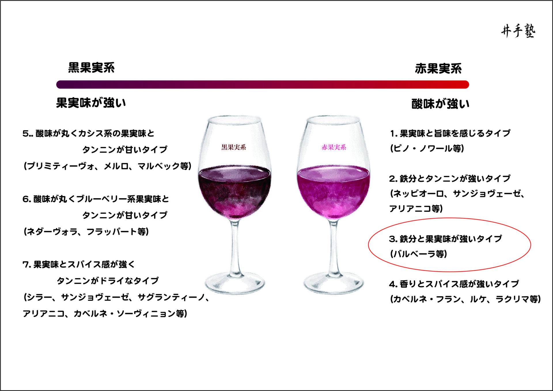 赤果実系で酸味と果実味と鉄分が強いタイプ(代表品種はバルベーラ)