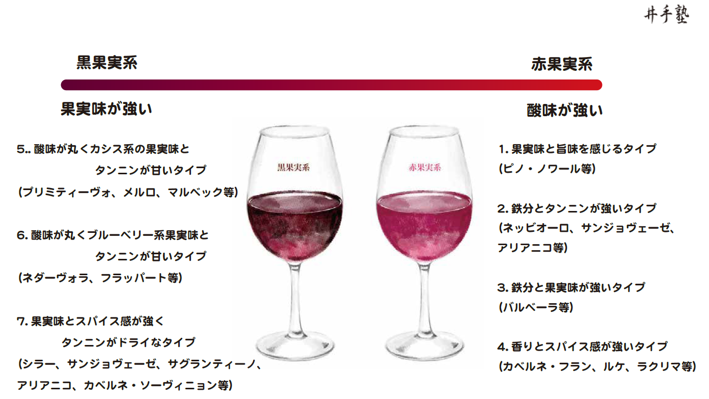 ※赤ワインは大きく分けて赤果実系のジャンル(ピノ・ノワール等)と黒果実系のジャンル(メルロ等)2種類に分かれる事が多いです。