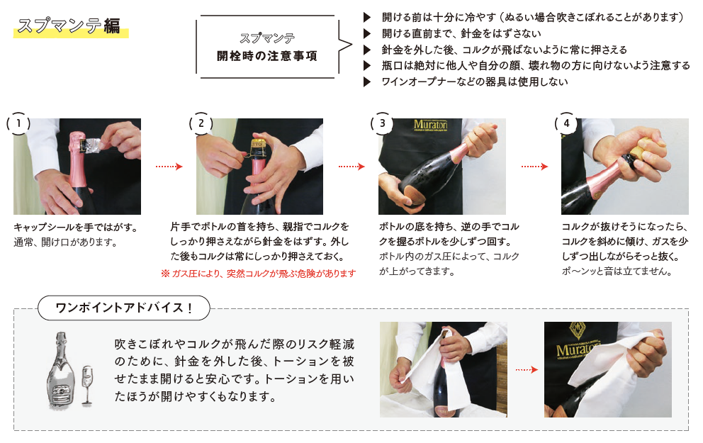 元ソムリエのスタッフによる解説付き動画をご参考くださいませ。カッコよく抜栓するコツなども教えちゃいます! ①スティルワインの抜栓 ▼画面をタッチすると動画が始まります ②スプマンテの抜栓 ▼画面をタッチすると動画が始まります Tweet