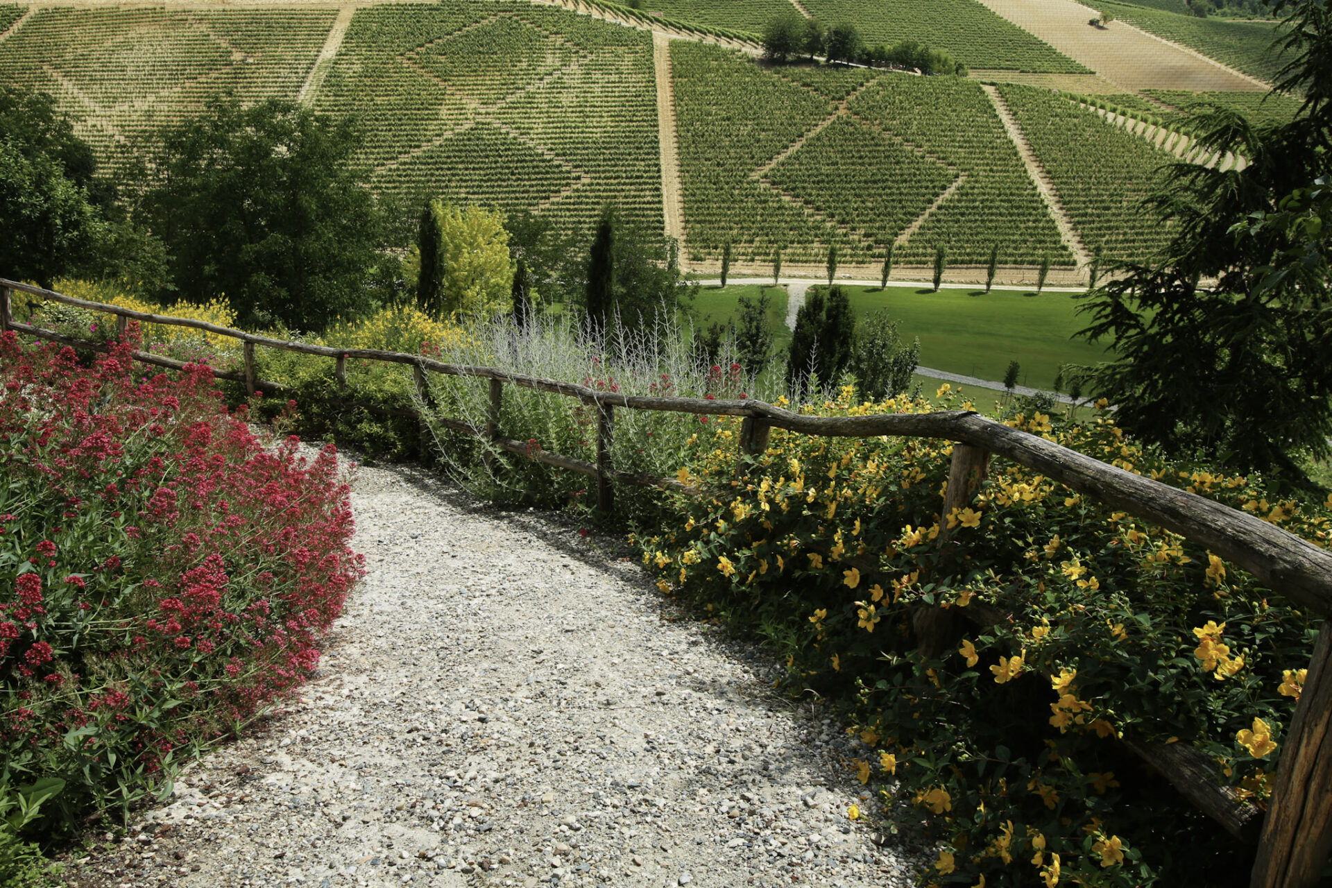 ワイナリーからブドウ畑までの道には美しい花々が咲き誇ります。
