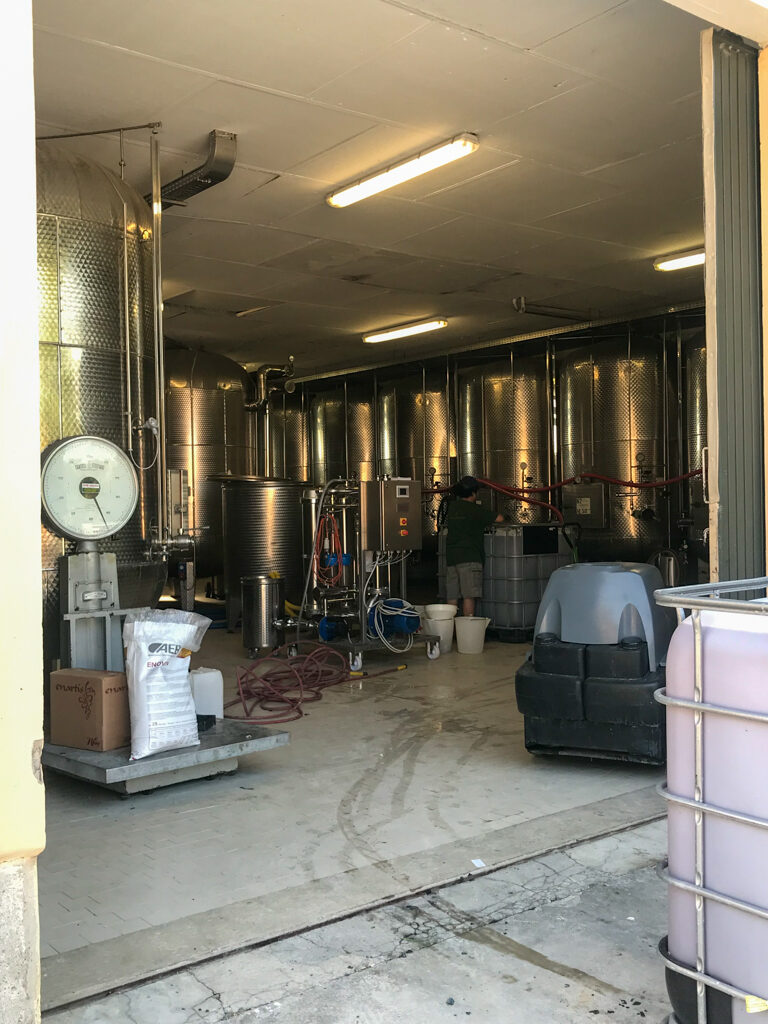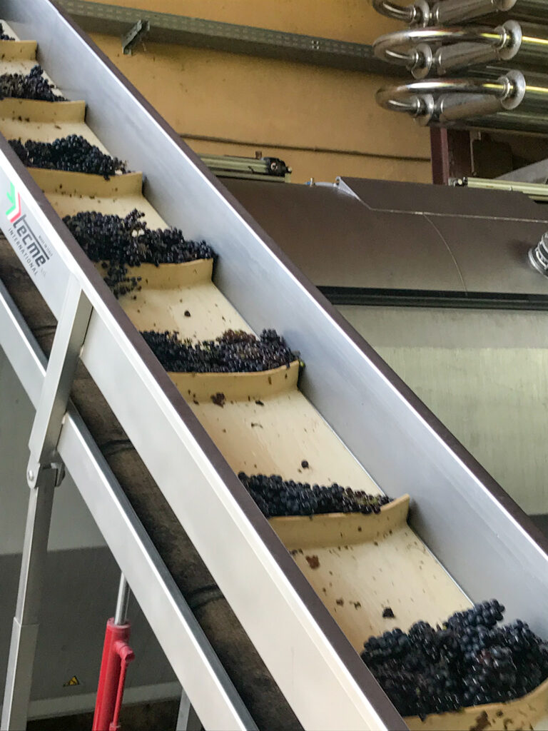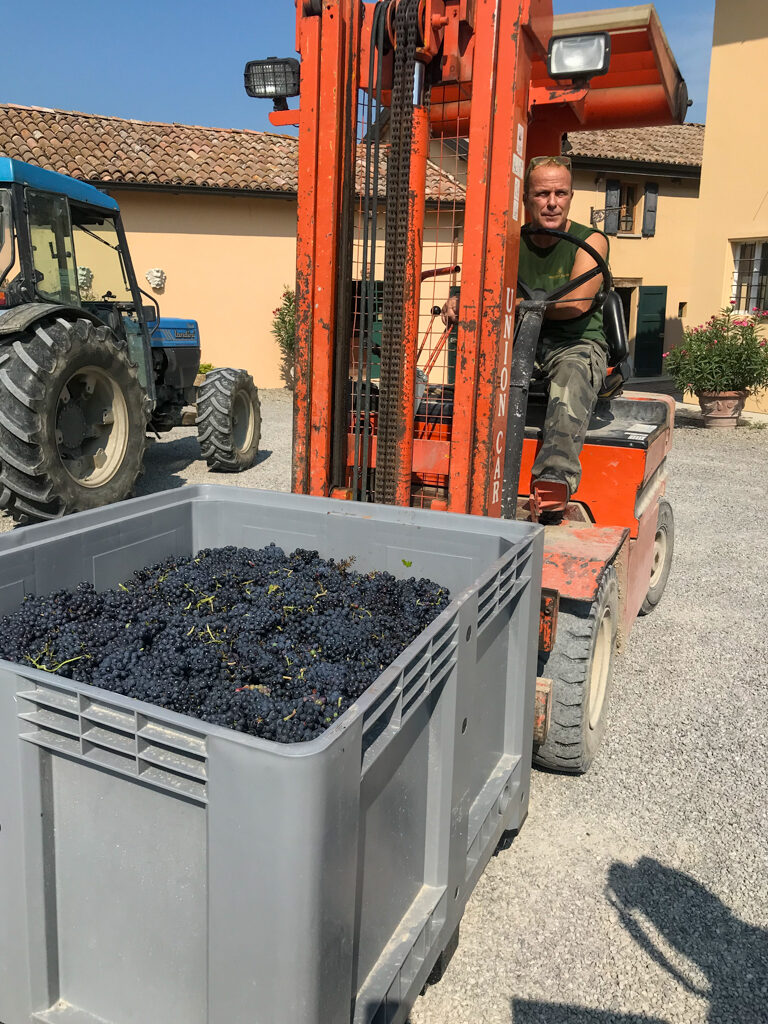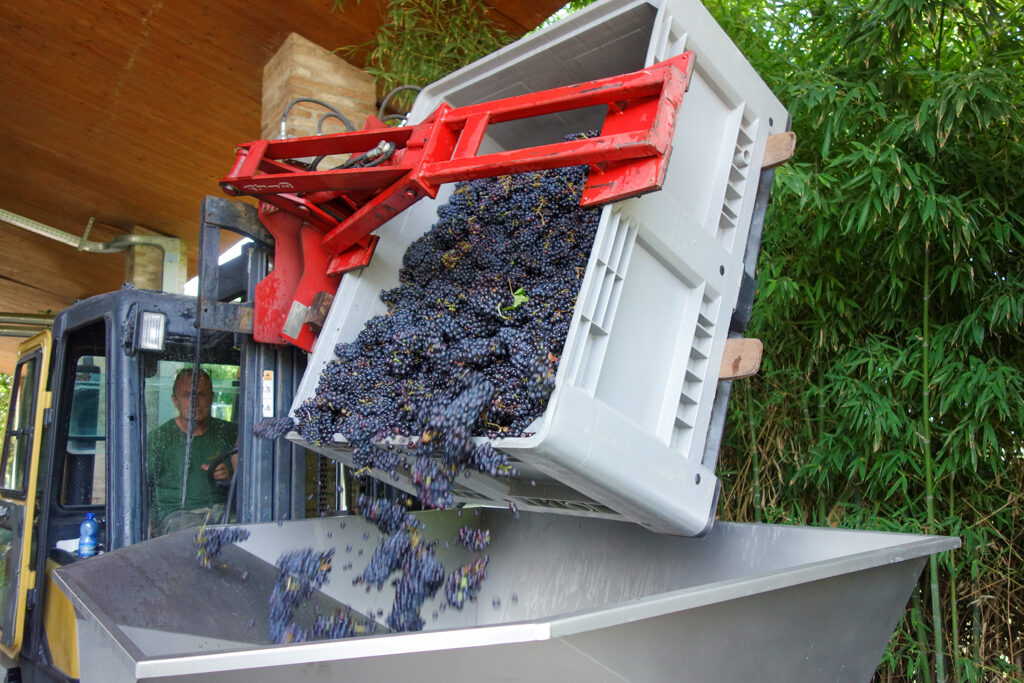 白のスプマンテになるため、素早くフォークリフトで何度も運びこまれます。