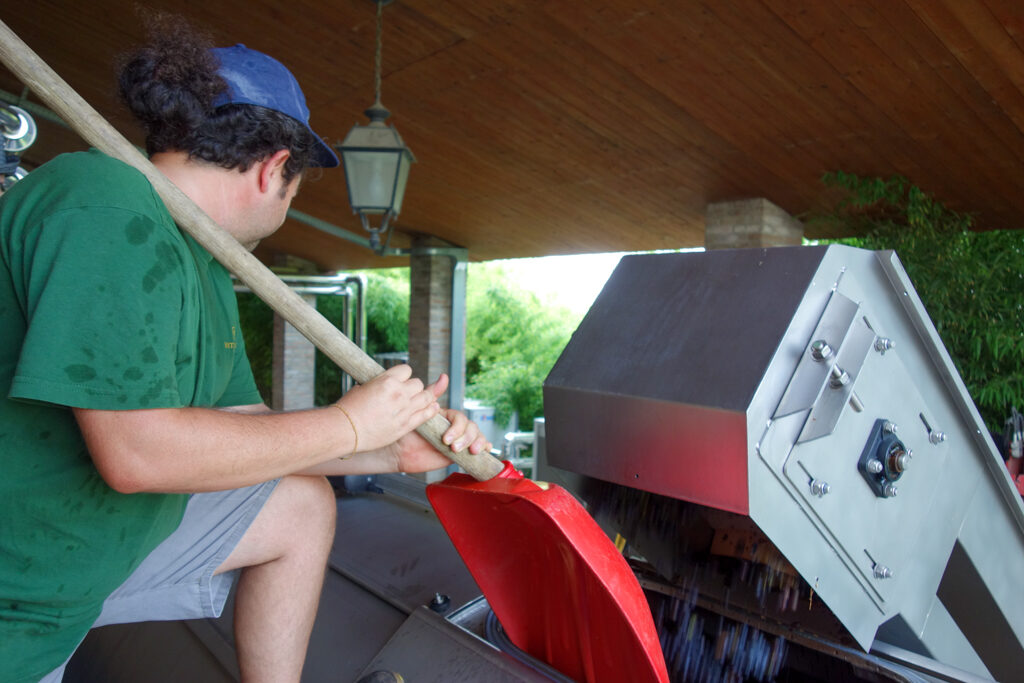 2メートル以上の圧搾機の上に上り、ブドウが詰まらないように、スコップで掻き出します。