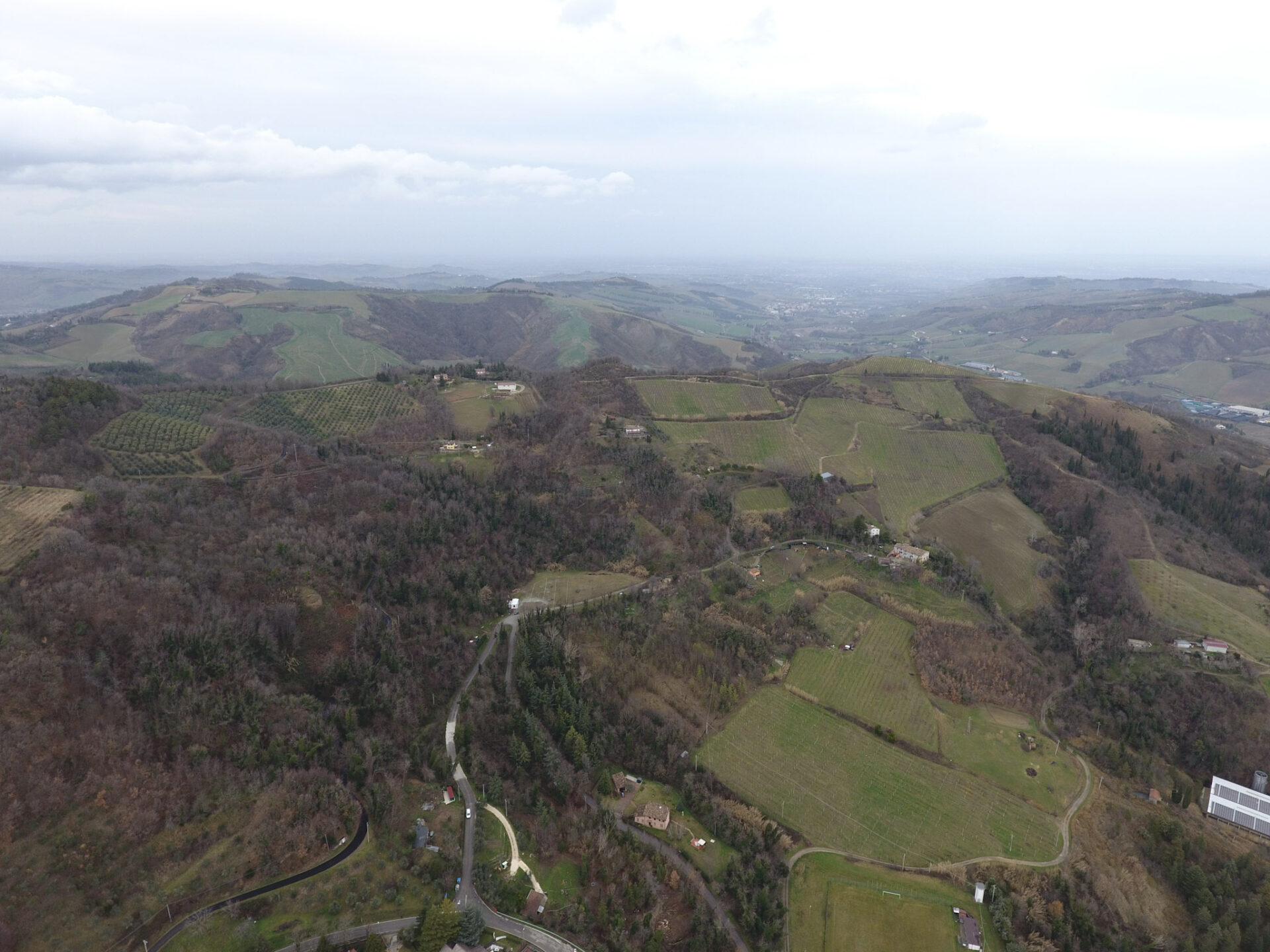 畑の空撮 平野が約半分を占めるエミリア=ロマーニャ州ですが、南部には丘陵地帯が広がります。