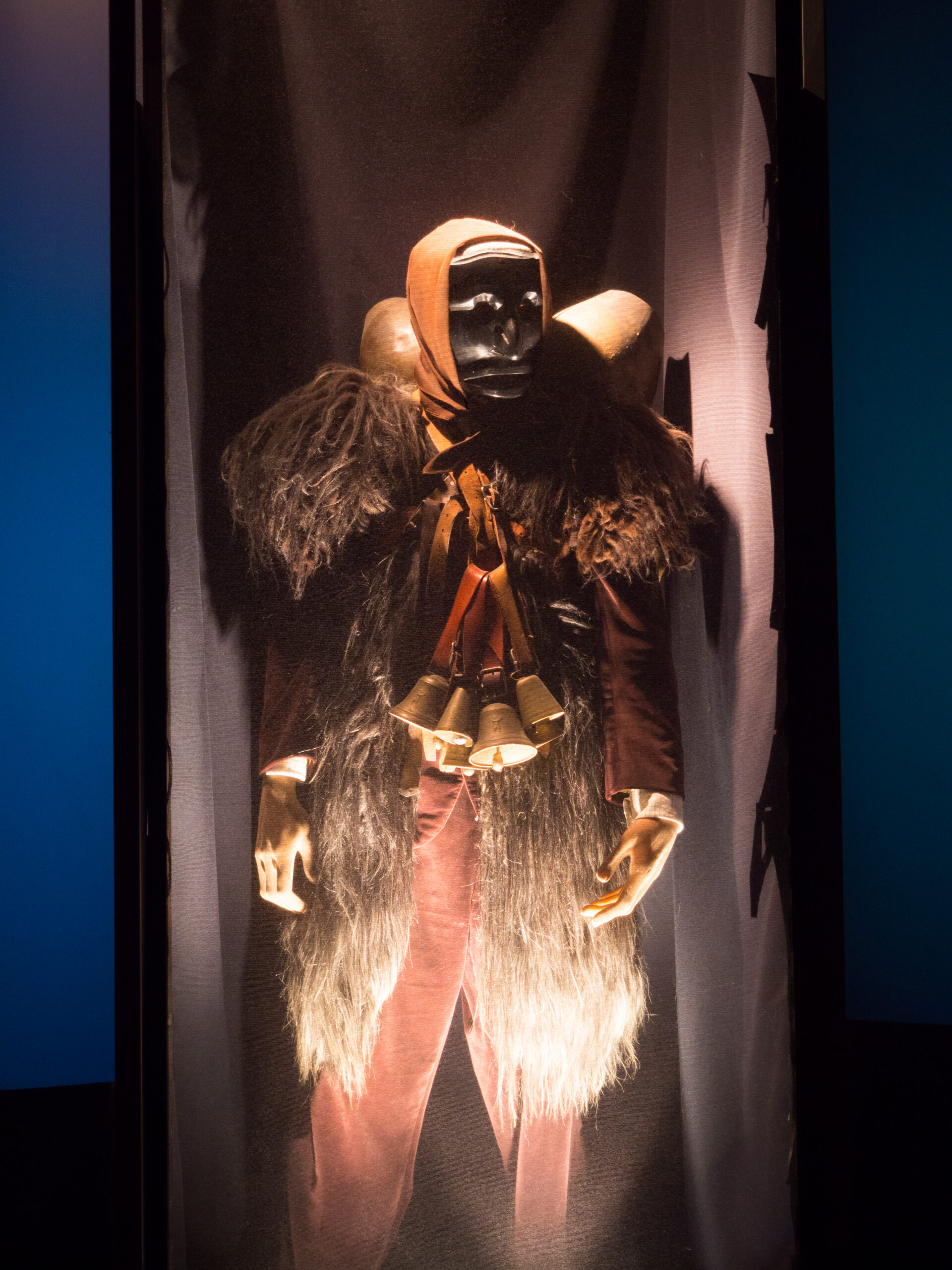 博物館に展示されているマムトーネス像。黒い仮面を被って黒羊の毛皮を纏い、ずっしりとしたカウベルをぶら下げ、練り歩きながらそのカウベルの音が村中に響き渡ります。