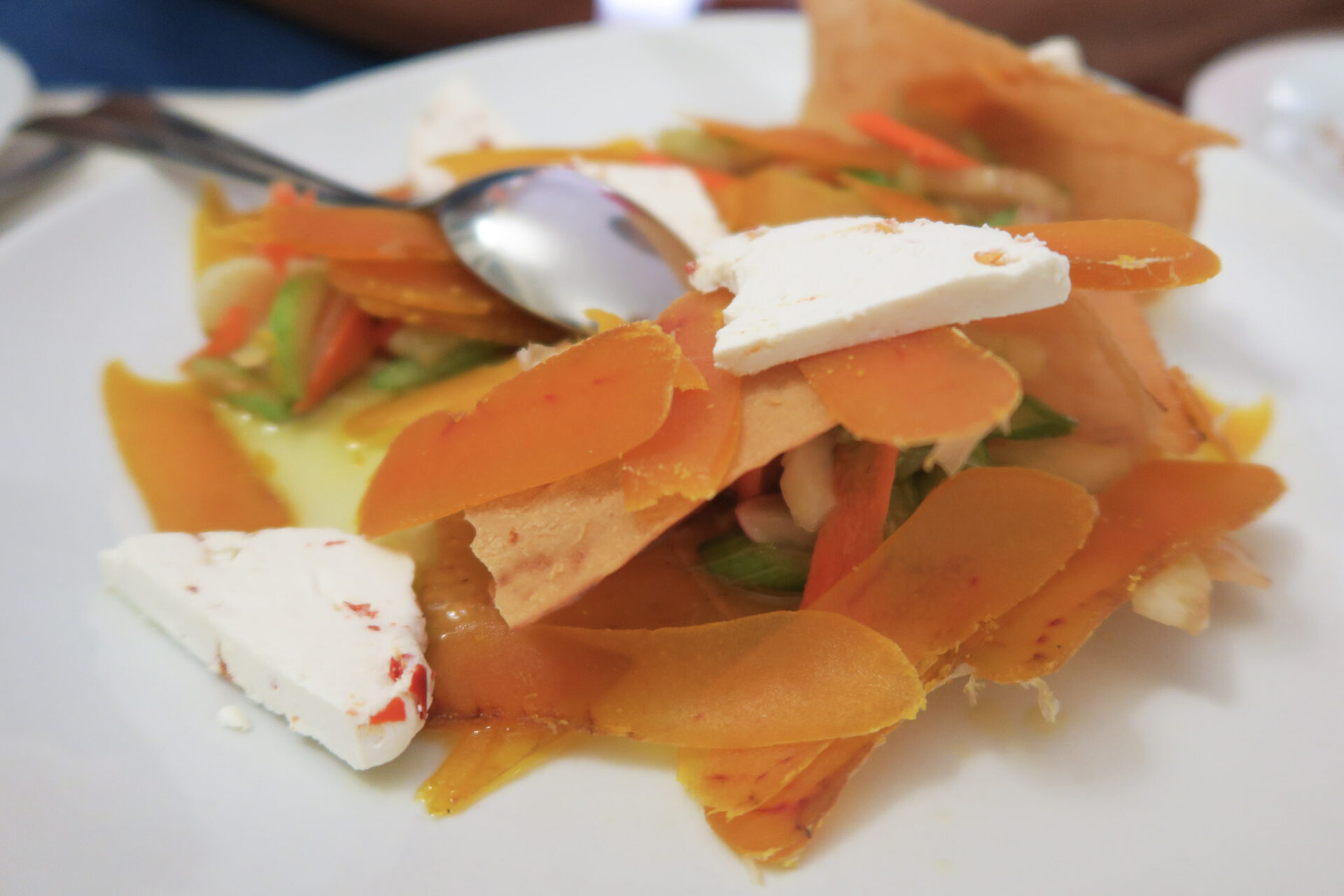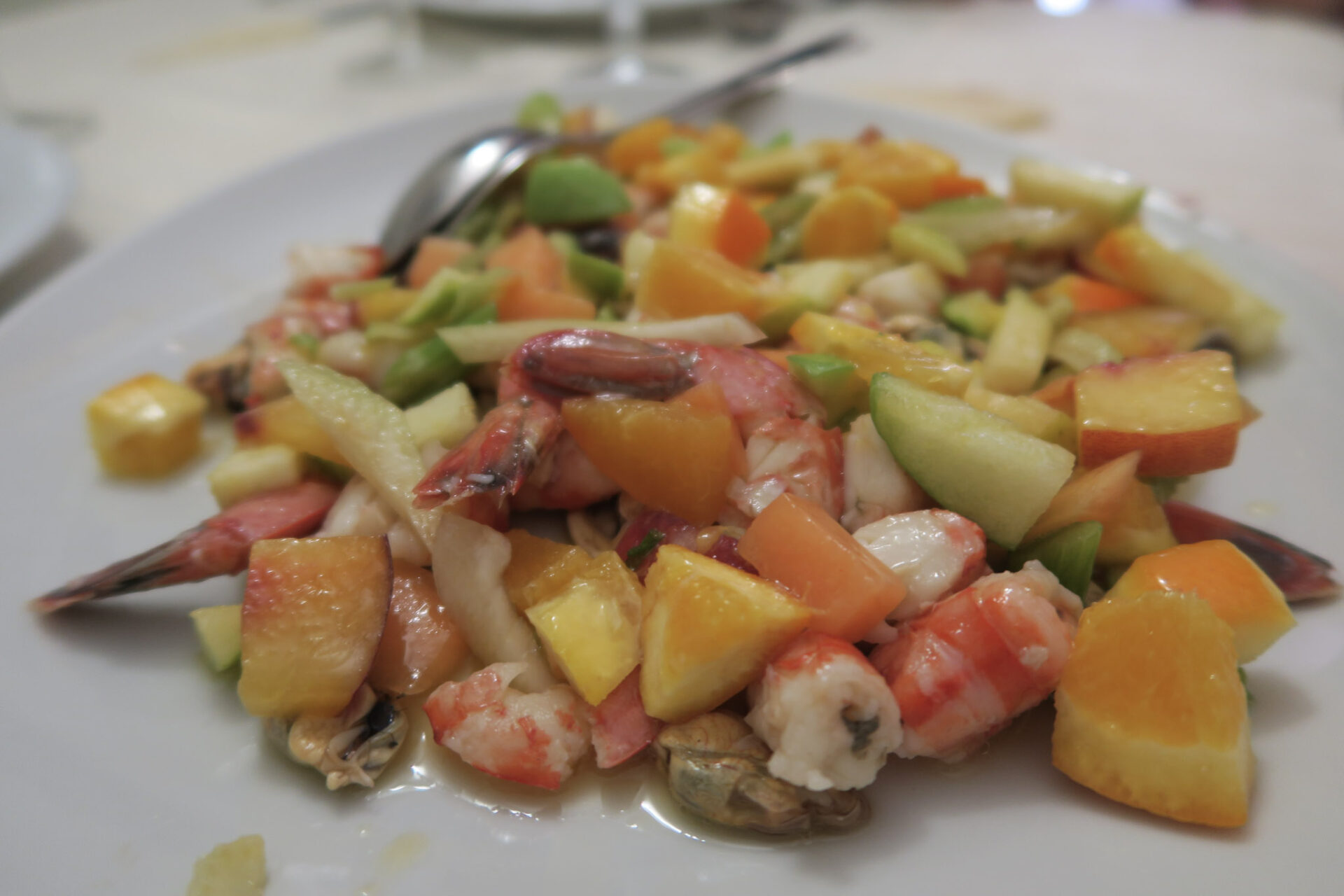 エビやムール貝の魚介にセロリ、桃、メロン、オレンジなどがはいった冷菜