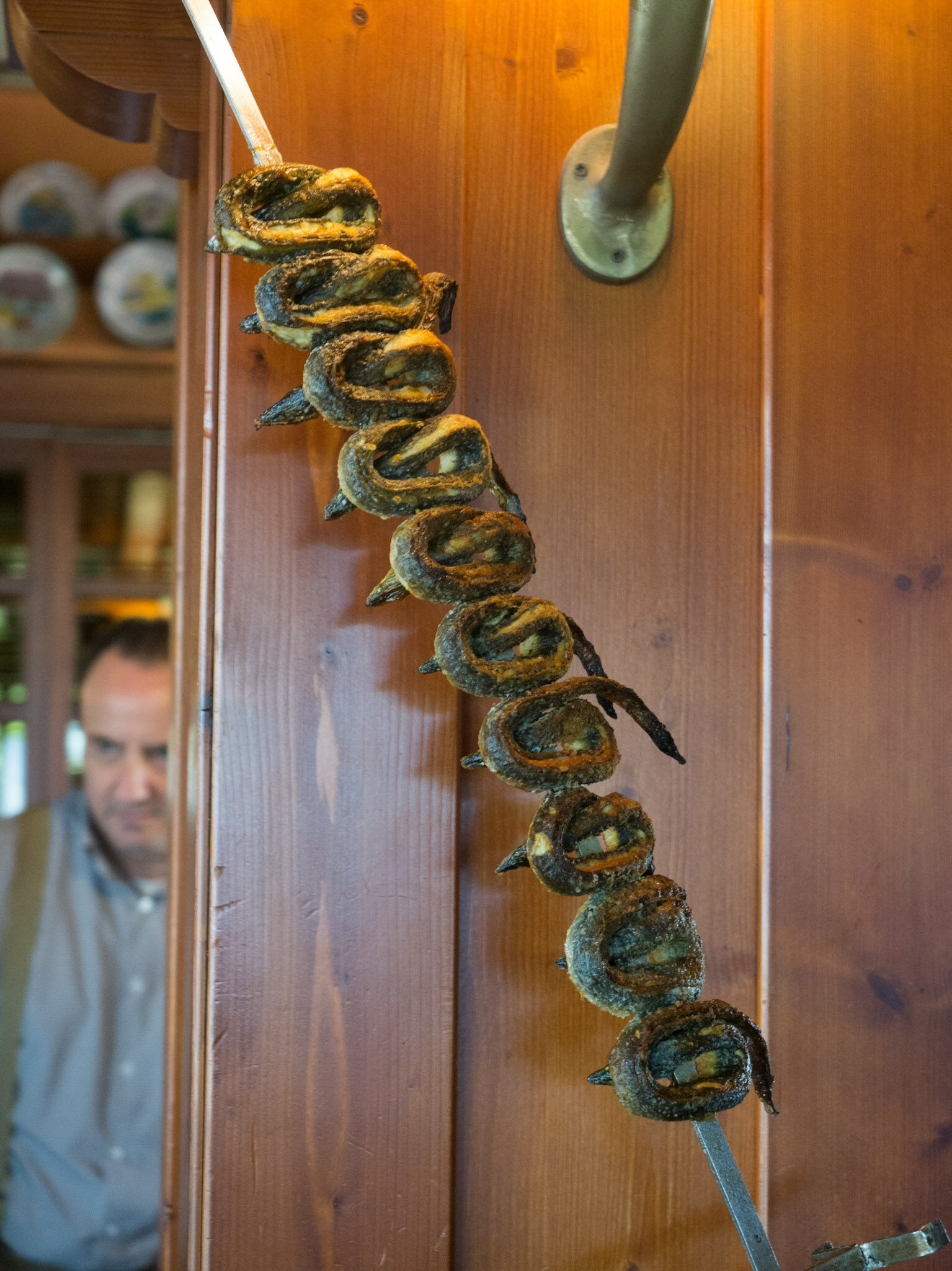 サルデーニャではよく食される剣で串刺しにした鰻のグリル
