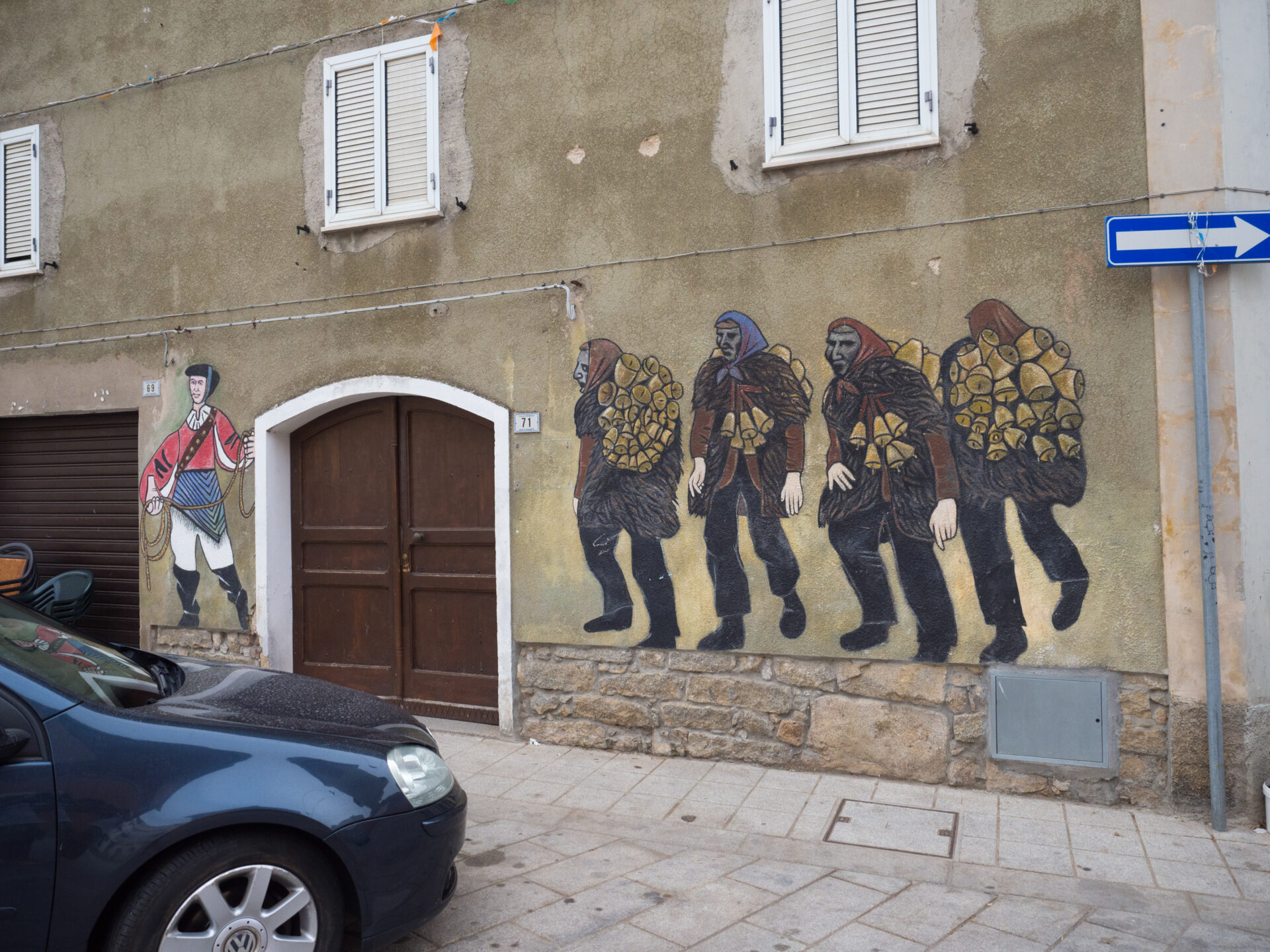 サルデーニャの中部の山岳地帯にあるマモイアーダ村。 毎年1月17日の聖アントニオ・アバーテの日に行われるカーニバルの練り歩く様子の壁画。 イッソアドレスという羊飼いが縄を振るいながら、悪霊や悪魔を象徴する黒い仮面を被ったマムトーネスを引き連れて村中を歩きます。サルデーニャ島は独自の文化が色濃くいまだに残っています。