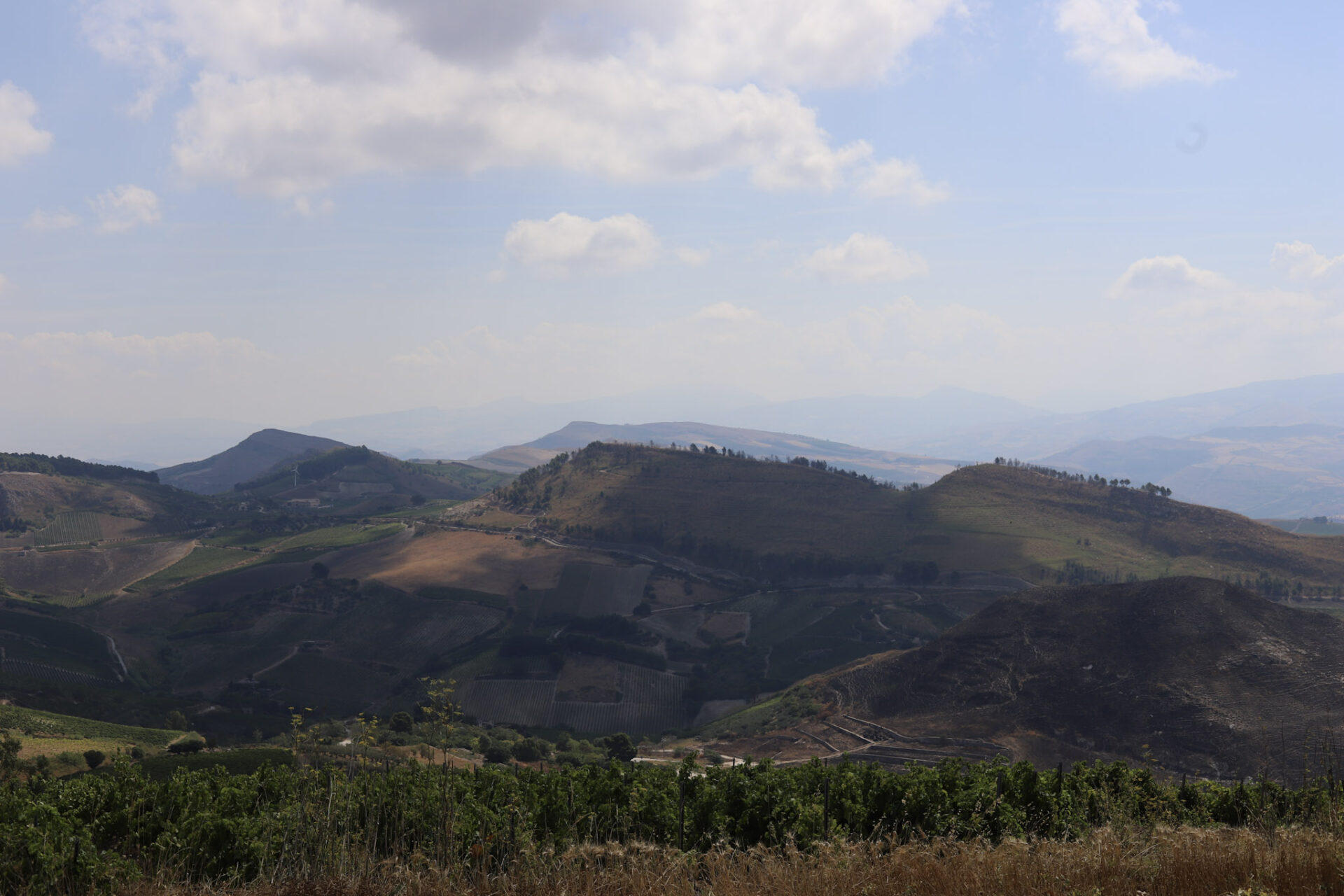荒涼とした土地が広がり、手前には焼畑が行われた丘も