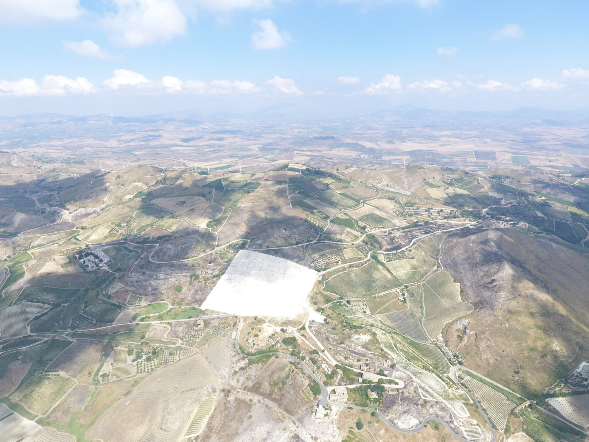 ドローンでシチリア西部を空撮 丘の上にそびえる白い物は…