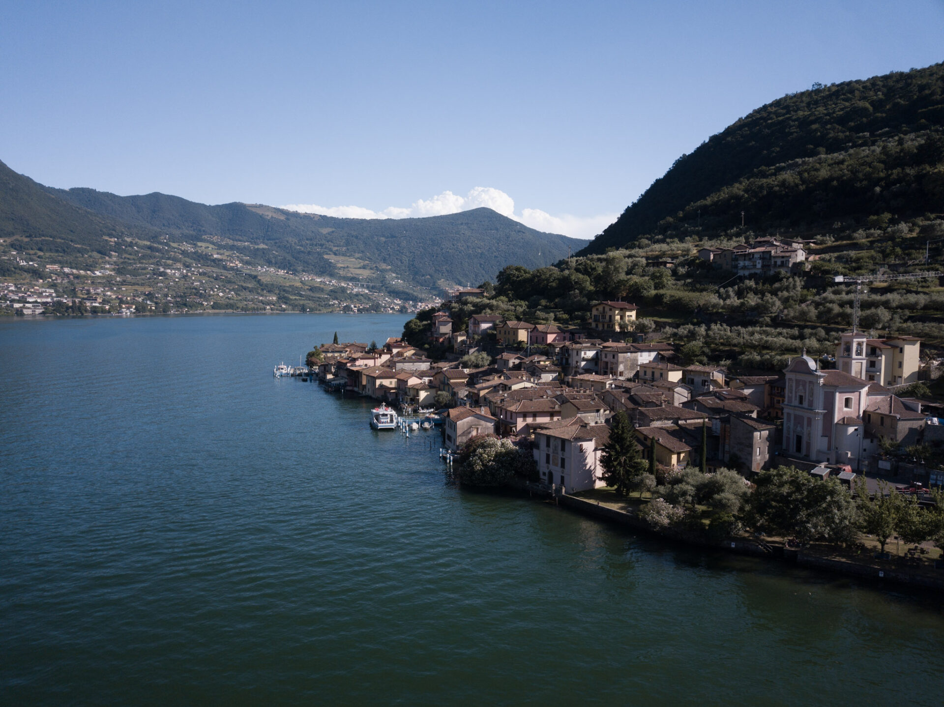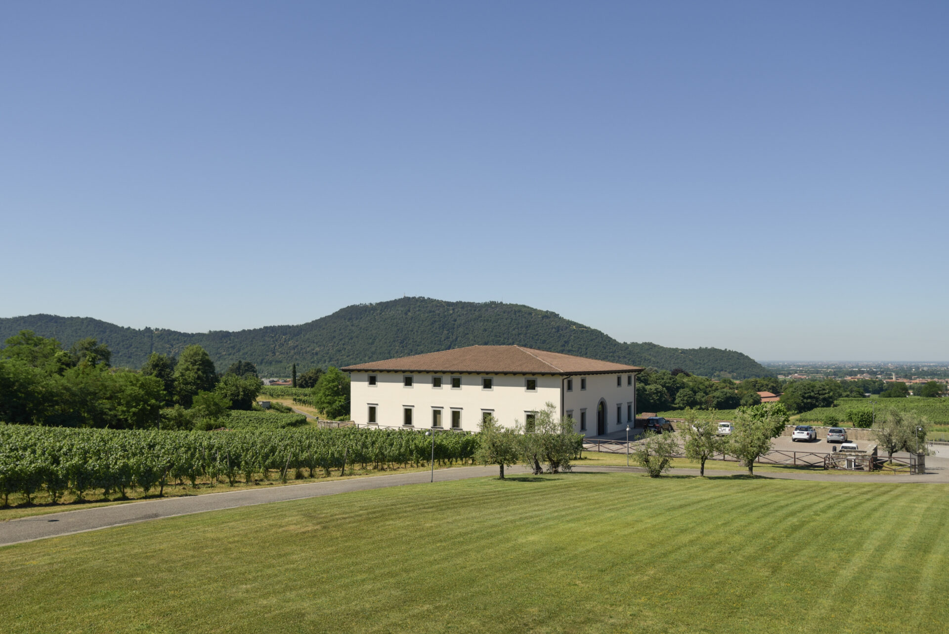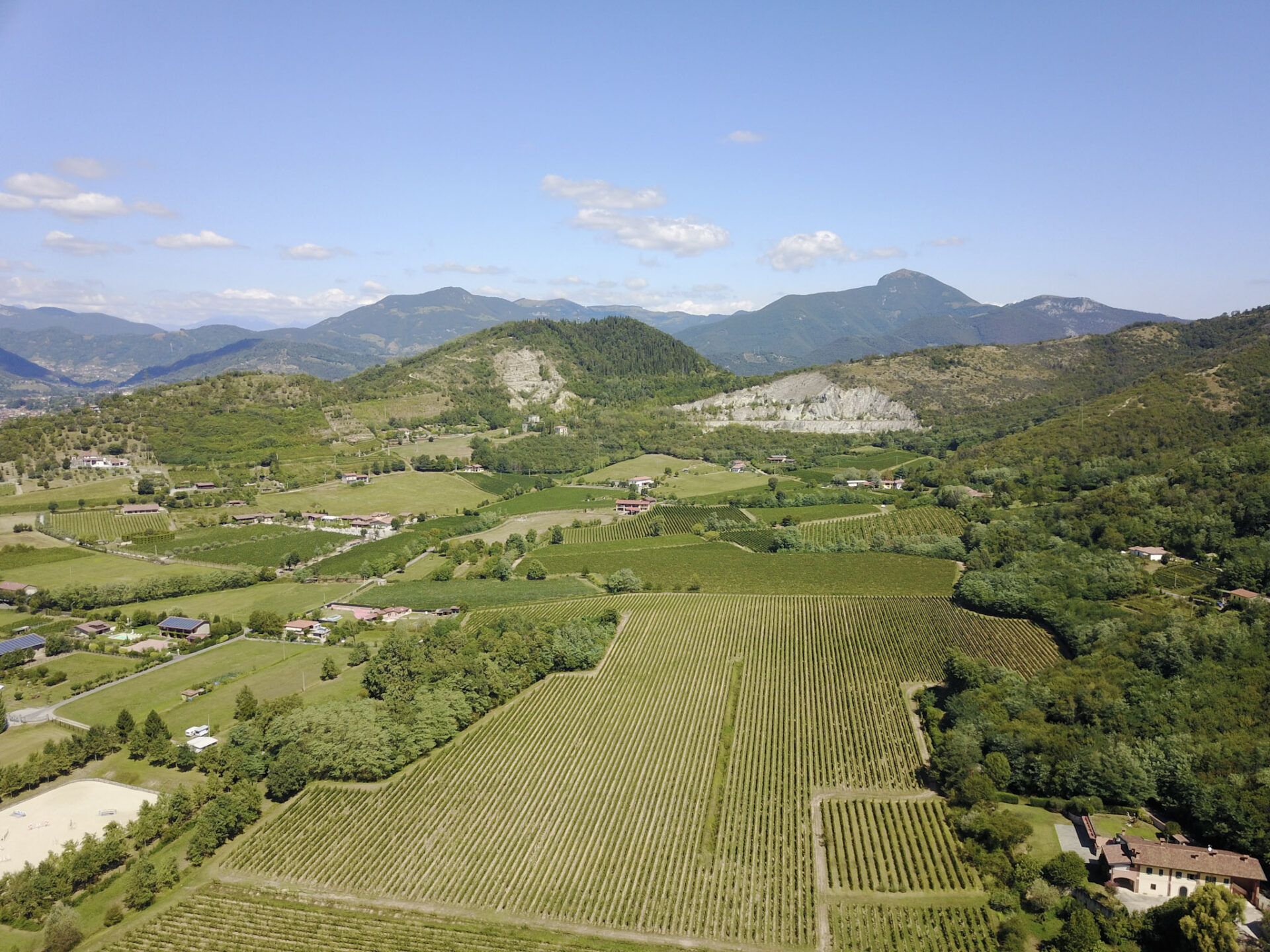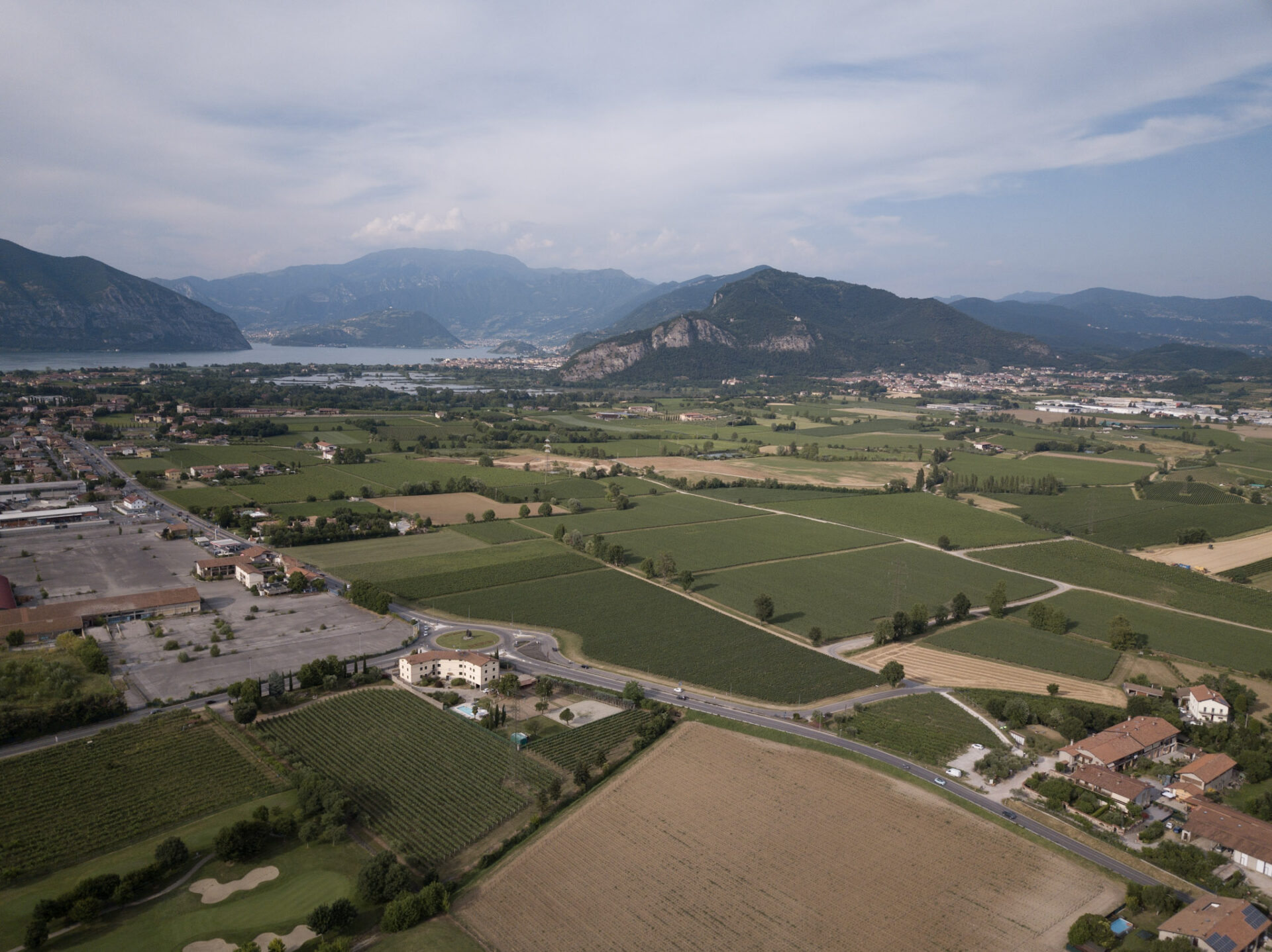 ムラトーリ社のワイナリー上空から。写真左奥に見えるのはイゼオ湖です。
