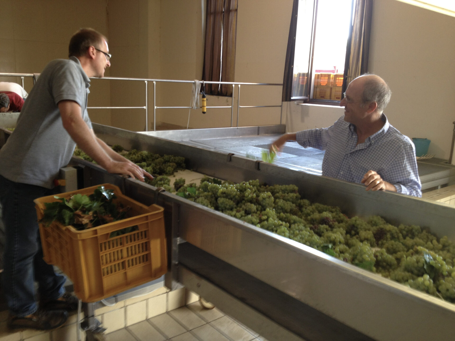 収穫したシャルドネをベルトコンベアーで運び、選果します。