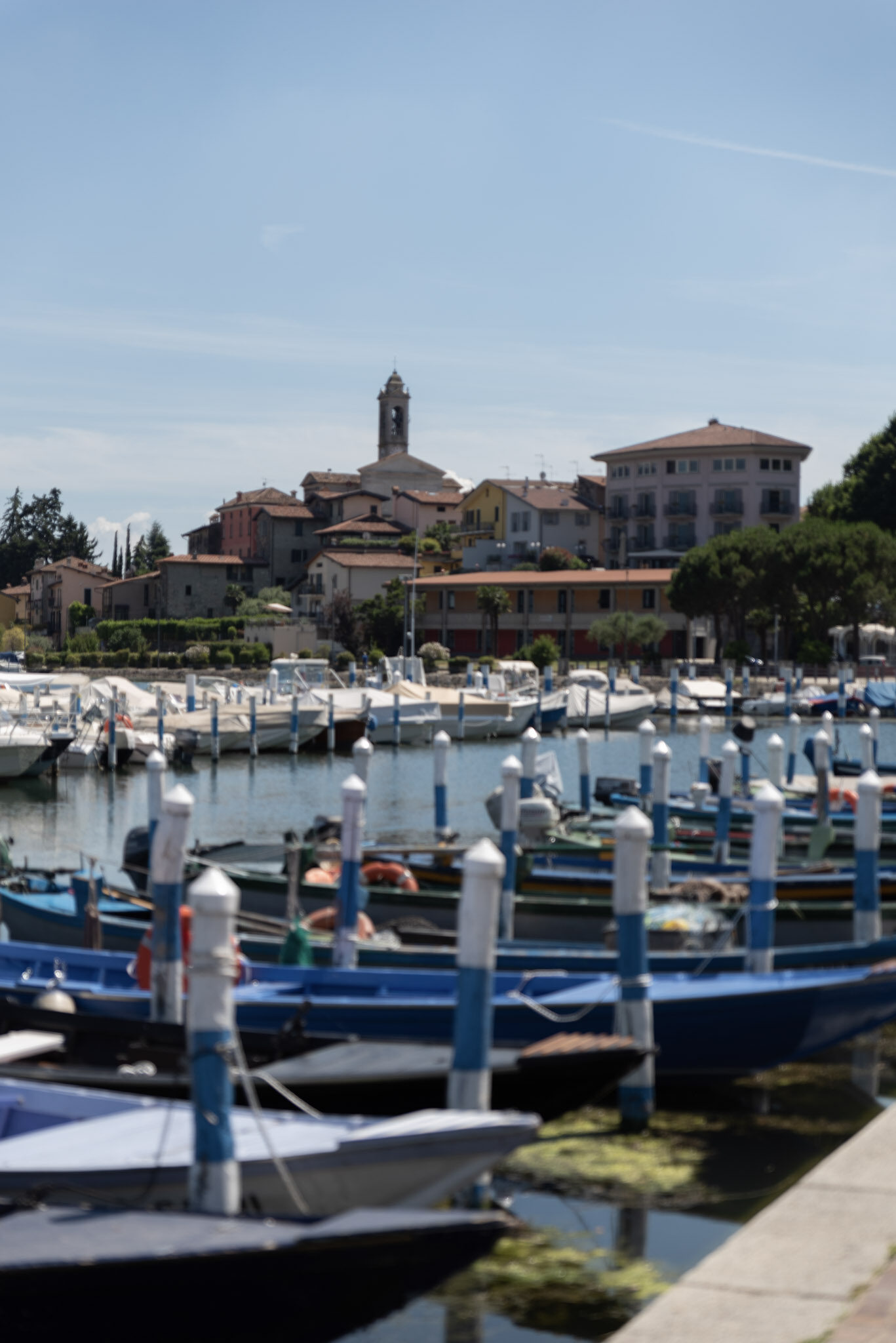 湖の港には多くの船が停泊しています。