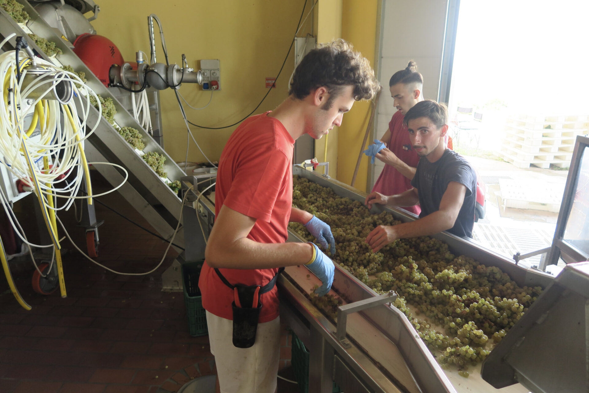 収穫したブドウを選別・除梗していきます。