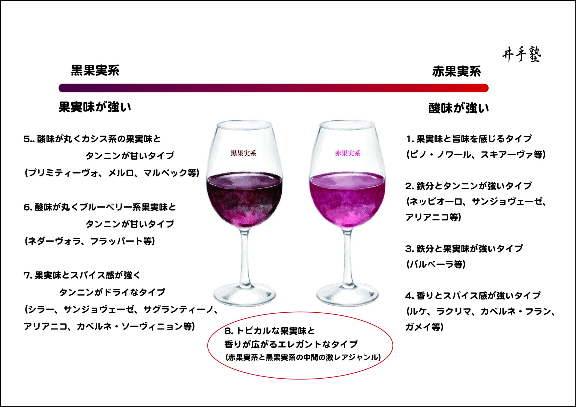 ※赤ワインは大きく分けて赤果実系のエレガントタイプ(ピノ・ノワール等)と黒果実系の果実味タイプ(メルロー等)2種類に分かれる事が多いです。