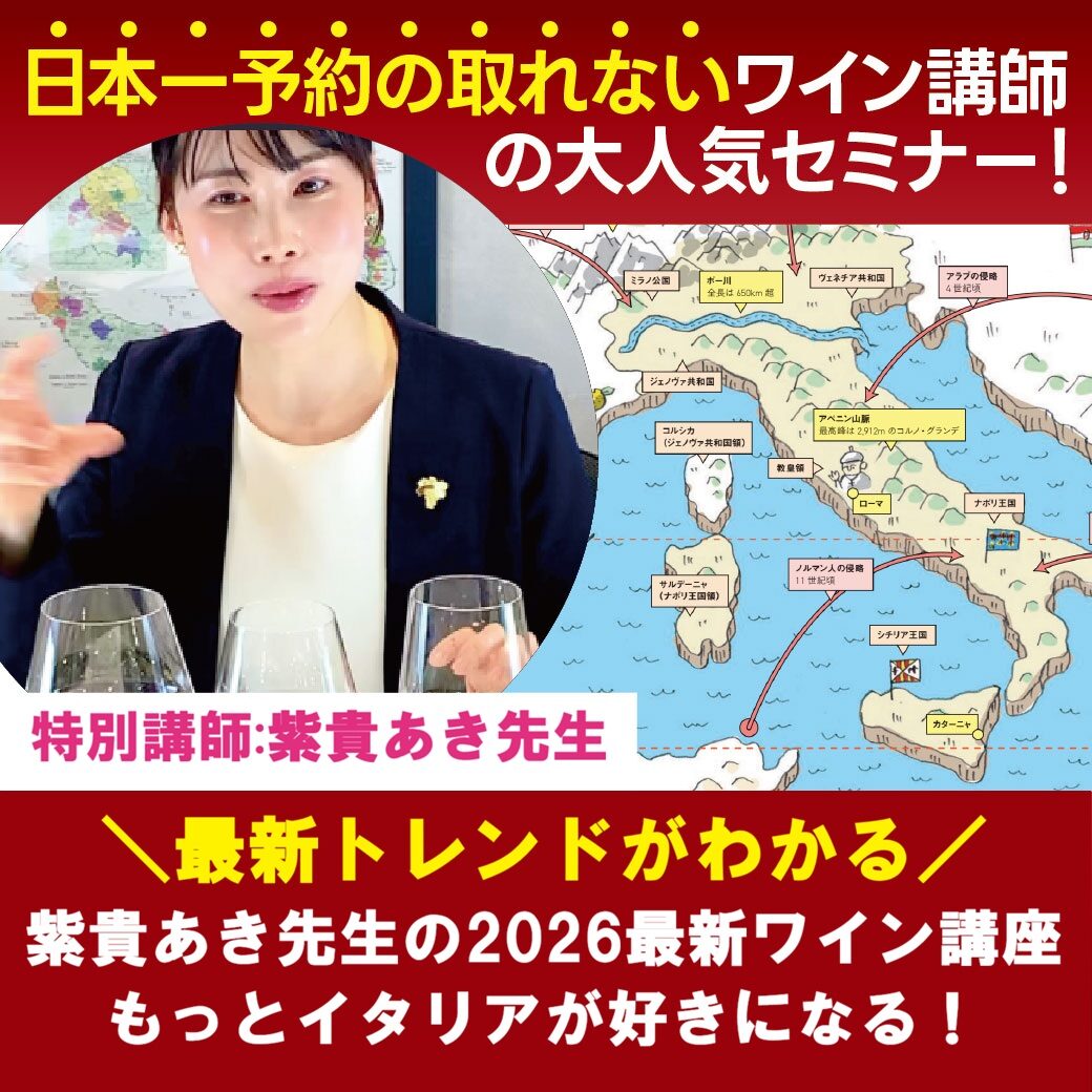 「\最新トレンドがわかる/紫貴あき先生の2026最新ワイン講座―もっとイタリアが好きになる!」紫貴さんならではのイタリアワイン講義をご期待ください。
