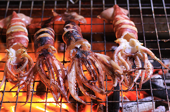 ・剣先イカのグリル、イカの甘味にトロピカルな果実味、酸味と苦味が補填される!ねっとり食材はトロピカル系ワインの本領発揮です!
